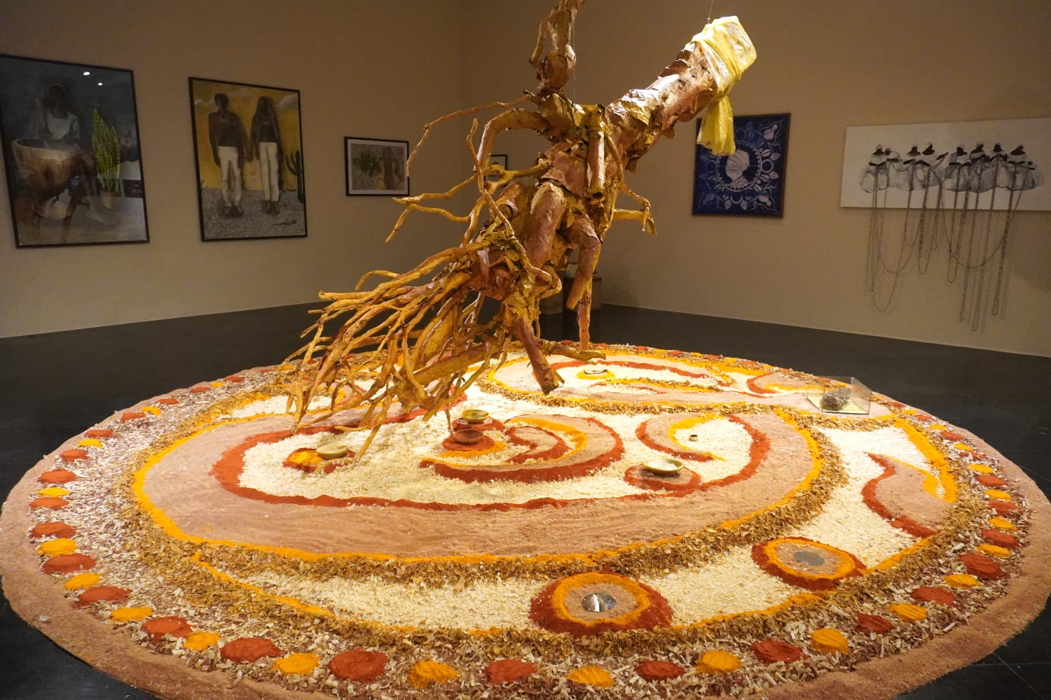 A instalação nasceu como um desenho ancestral e foi se expandindo até assumir caráter tridimensional. Elementos como cascas de insetos, tecidos, miolos de árvore, pratos com tinta, espelhos e uma árvore de papel compõem um espaço ritual que, segundo a artista, é “ao mesmo tempo uma ode à ancestralidade e um chamado para refletir sobre as urgências históricas do Brasil”.