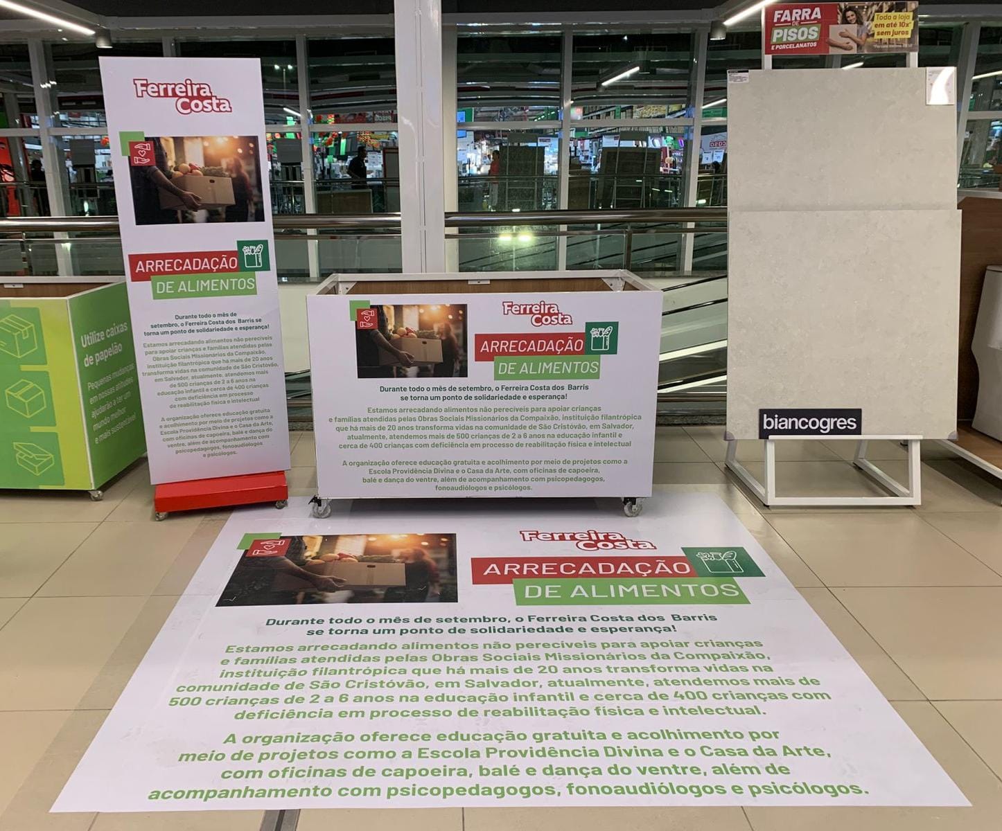 A Ferreira Costa dos Barris, em Salvador, está promovendo ao longo do mês de setembro uma campanha de arrecadação de alimentos não perecíveis em parceria com as Obras Sociais Missionários da Compaixão. Os donativos podem ser entregues em uma urna instalada no piso 1 Farol da Barra, dentro da loja.